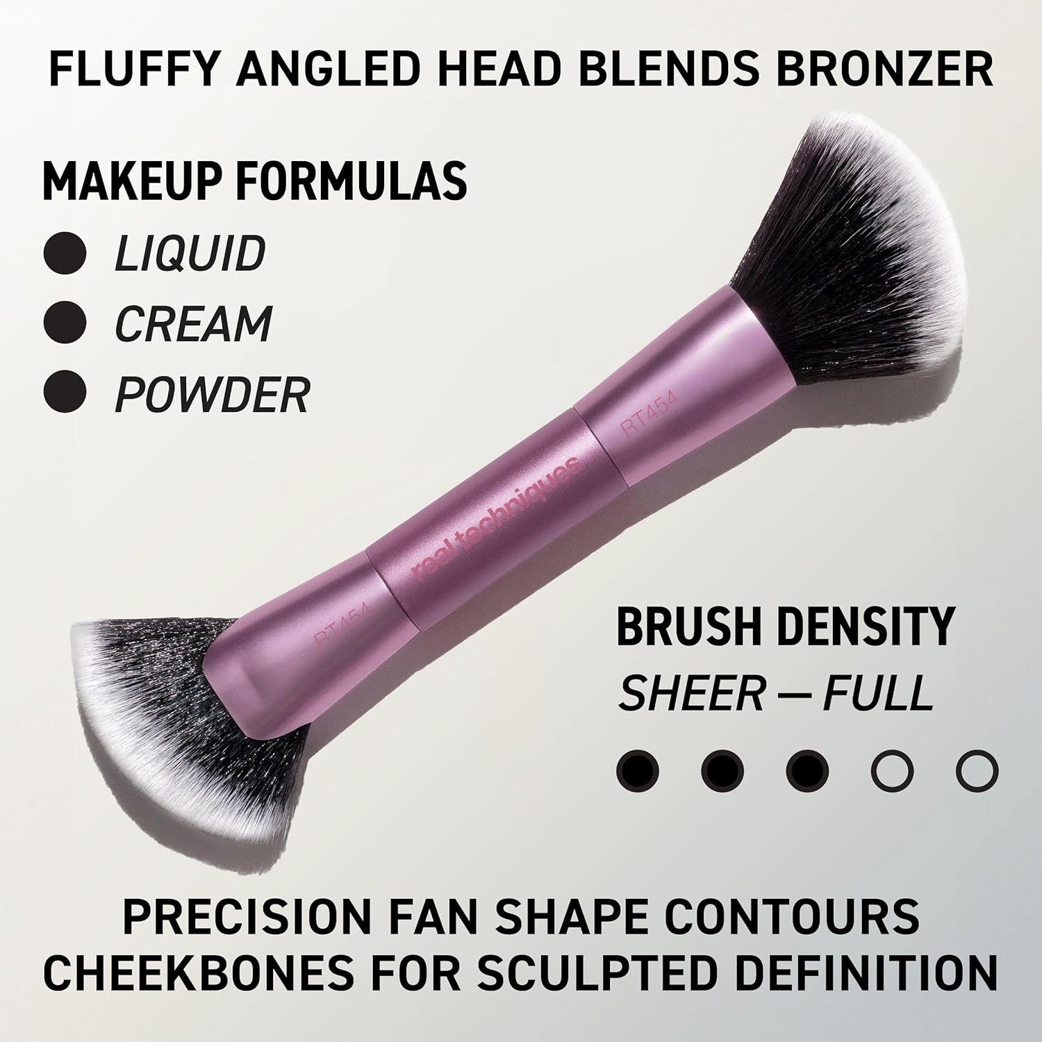 El set de brochas de maquillaje Big Blends Energy + esponja de doble cara de Real Techniques incluye 9 herramientas multiusos diseñadas para una aplicación precisa y un control máximo del color. El set incluye la brocha de acabado en abanico angular 454, la brocha para rubor Cat Paw 455, la brocha delineadora piramidal 364, la brocha para ojos Layer + Liner 367, la brocha plana para corrector + contorno 269 y la esponja para polvos Miracle 2 en 1.