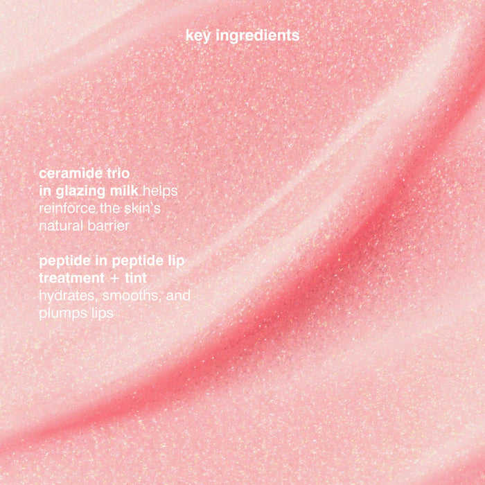 Nuevos productos esenciales para una piel radiante y unos labios radiantes para salir por la noche. Glazing Milk es una esencia de ceramidas para una piel hidratada y luminosa. Peptide Lip Treatment en Strawberry Glaze es un brillo nutritivo con un fresco aroma a donut glaseado de fresa. El tinte labial Peptide en Jelly Bean tiene un toque rosa bebé brillante y un dulce aroma a gominola.