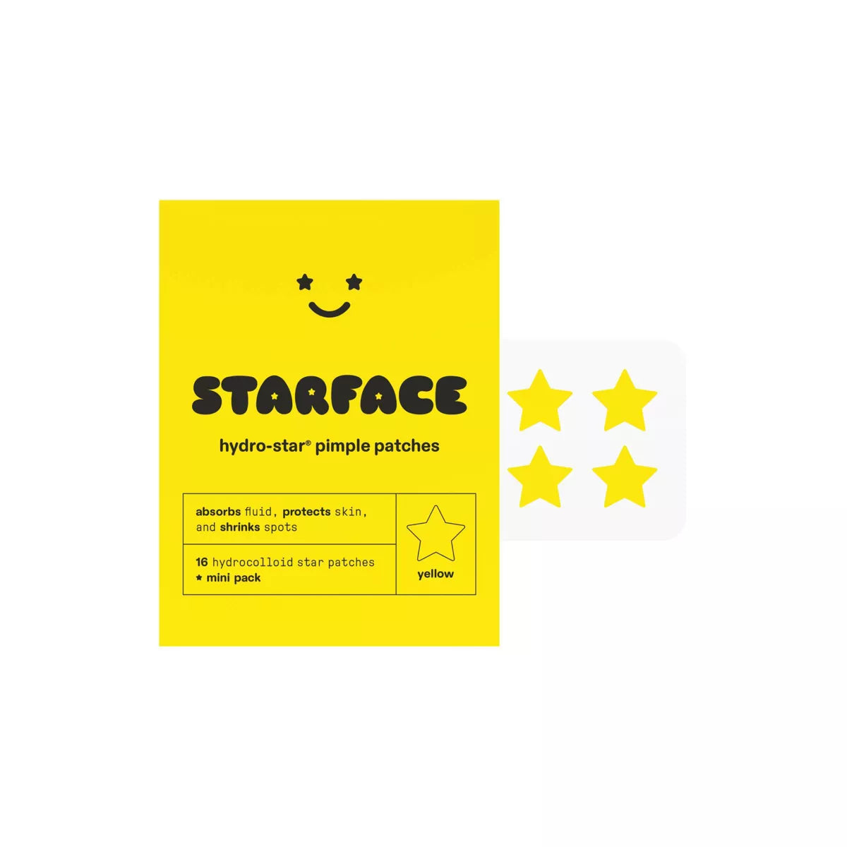 Exprésate y siéntete guapa con el minipaquete de parches hidrocoloides para granos Starface Hydro-Star®: un set de 16 parches hidrocoloides amarillos para granos que ayudan a absorber líquidos, reducir el enrojecimiento y reducir las manchas.