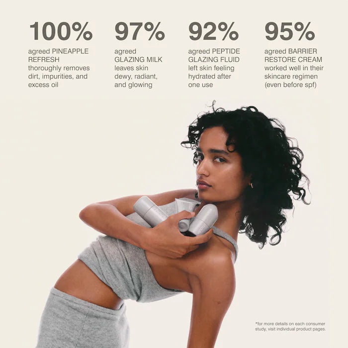 Descubre tus nuevos clásicos: Pineapple Refresh, Glazing Milk, Peptide Glazing Fluid y Barrier Restore Cream. Cada uno está formulado para una máxima nutrición de la barrera cutánea, se siente de maravilla en la piel y es multifuncional en tus rutinas de cuidado de la piel y maquillaje.