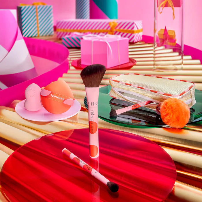 Qué más necesitas saber: ¿Qué contiene? Tres brochas de la gama SEPHORA COLLECTION Essentials (una para mejillas y dos para ojos), con un nuevo look rosa con lunares naranjas. Para tu rostro, apuesta por el dúo de esponjas de maquillaje. Incluye un nuevo producto de la marca para 2025: Tap That Puff, una suave esponja acolchada para un resultado óptimo con solo unos toques. Esta selección festiva viene en una bolsa transparente tejida con hilos dorados y decorada con un pompón naranja. Un regalo navideño perfecto o tu aliado ideal para llevar tus esenciales de maquillaje a todas partes.